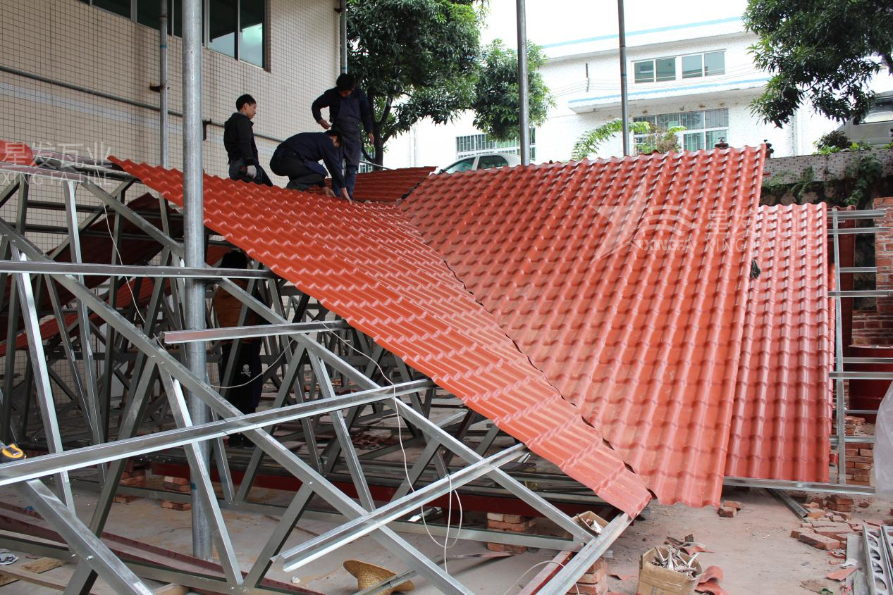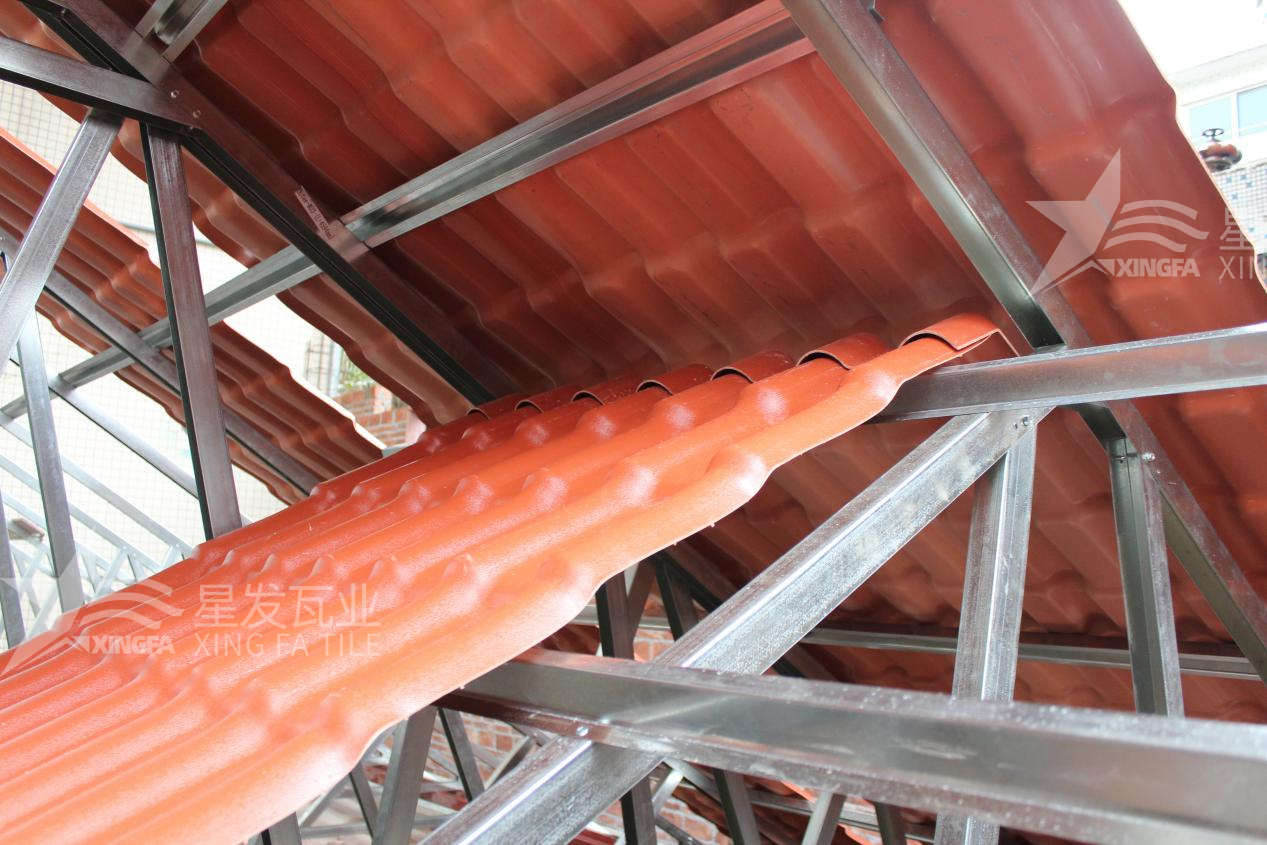 合成樹脂瓦的安裝要求相對簡單,可以適用于鋼結構搭建樹脂瓦、木結構或混凝土結構的屋頂。支架材料可以選擇方管鋼(60×40×3㎜)、C型鋼(100×50×20×3㎜)或防腐木方材料(60×40㎜)。如果選擇方管或C型鋼作為支架材料,需要進行防腐處理,以免受到腐蝕和生銹的影響,從而保證房屋的整體使用壽命。